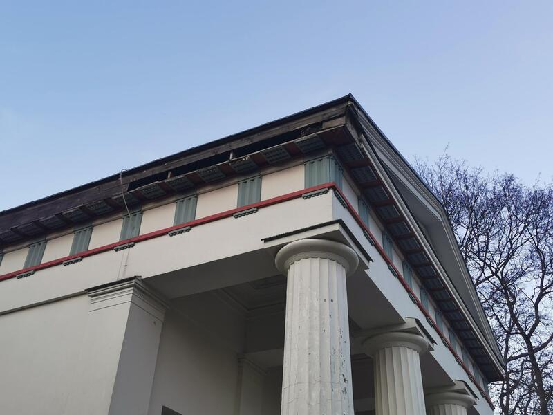 1. Dach/Dachkasten defekt, Wasser tritt in die Dachkonstruktion ein, das Holz fault. 2. Putz an Säule abgeplatzt, Feuchtigkeit tritt ins ungeschützte Mauerwerk