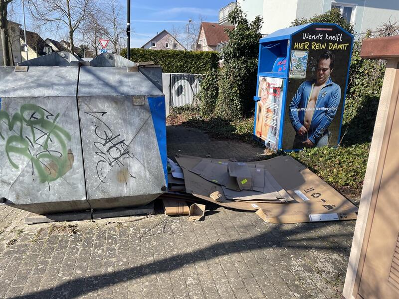 Wieder ist der Containerplatz überfüllt mit Pappe! Die Adressaufkleber der Verursacher sind auch wieder gut zu erkennen!