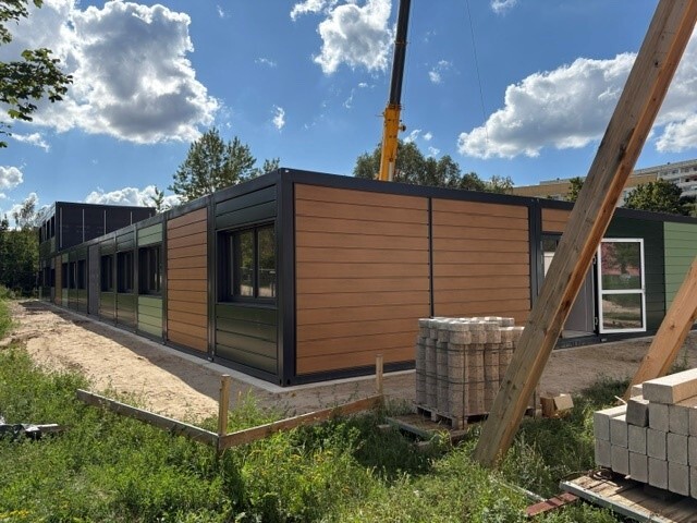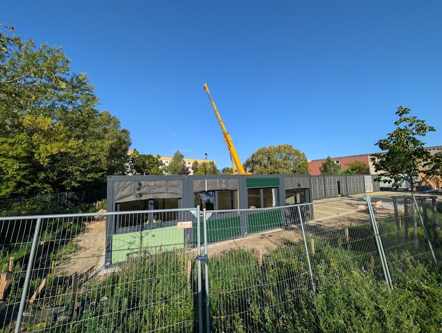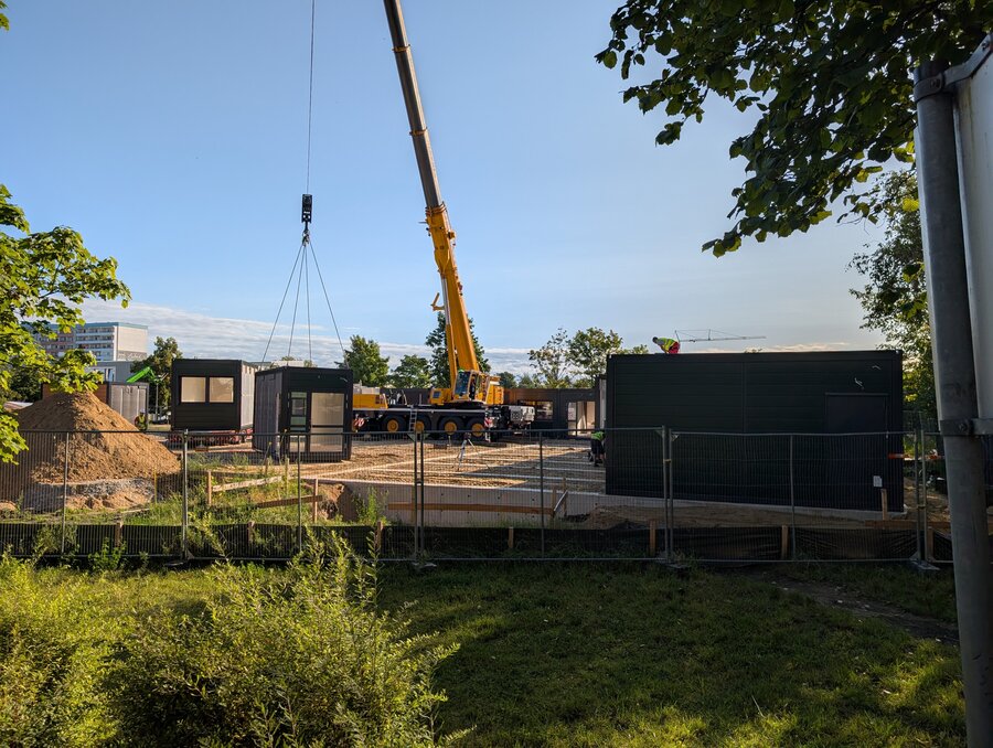 Im September war es soweit: Die Module für den Erweiterungsbau wurden angeliefert. Mit Unterstützung eines großen Krans setzte ein Team die einzelnen Container Stück für Stück auf das vorbereitete Fundament. Insgesamt wurden 110 Module geliefert und montiert – da auf einen LKW immer 2 Container passen, waren 55 LKW-Fahrten erforderlich. Übrigens: Alle Container wurden in Deutschland gefertigt.