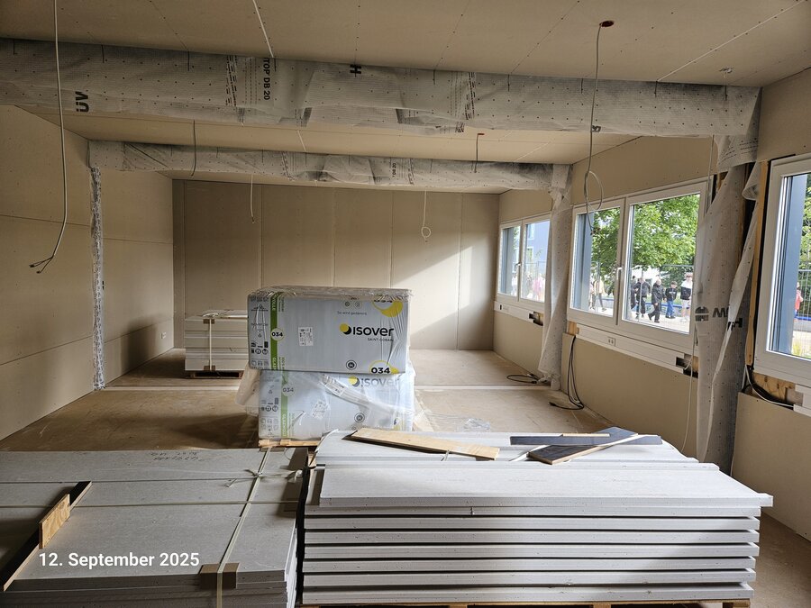 Der Innenausbau im Erweiterungsbau schreitet sichtbar voran. In den neuen Unterrichtsräumen sind bereits erste Bodenbeläge verlegt, Wände gespachtelt und gestrichen. Auch die Decken mit Akustikelementen sind weitgehend montiert. Damit wird spürbar: Aus einzelnen Modulen sind nach und nach richtige Klassenräume geworden.