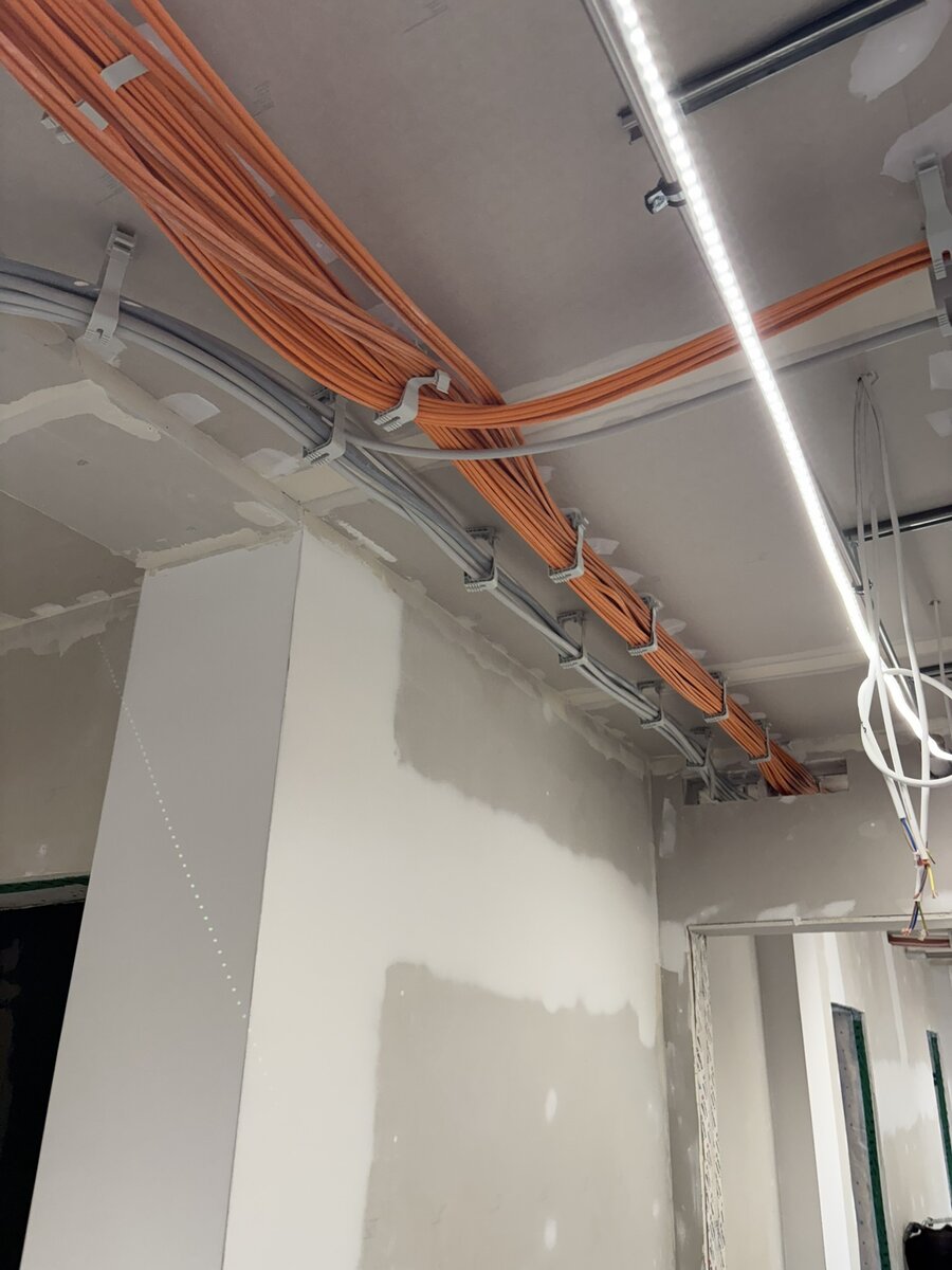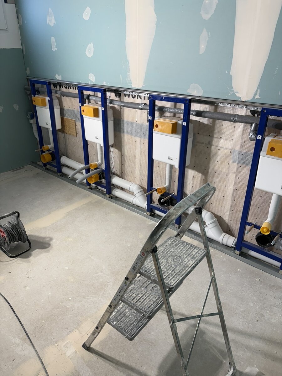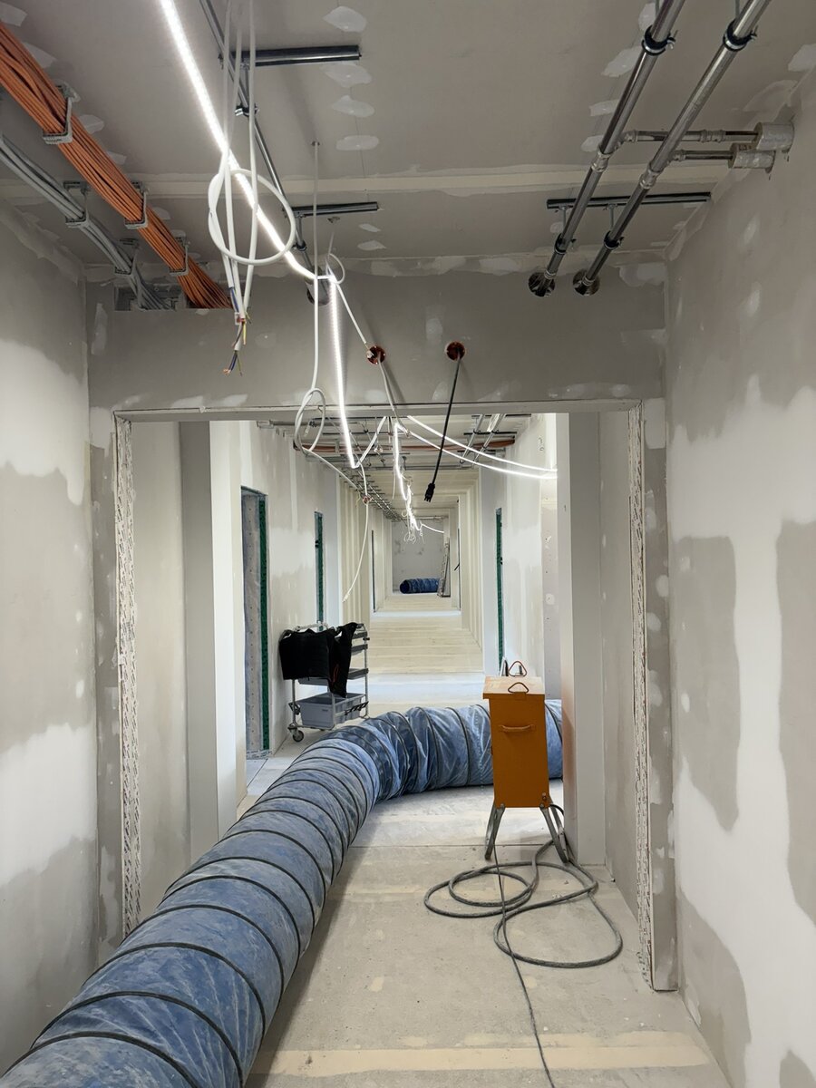 Parallel dazu läuft die technische Ausstattung auf Hochtouren. Die Rohinstallation für Heizung, Lüftung und Sanitär wird weitergeführt und vervollständigt. Auf den aktuellen Bildern ist bereits zu sehen, wie die Konsolen für die späteren Sanitärbereiche montiert sind. Auch die Elektroarbeiten schreiten sichtbar voran: Kabeltrassen werden verlegt, Anschlüsse vorbereitet und die Infrastruktur für Beleuchtung, Steckdosen und Steuerungssysteme geschaffen.